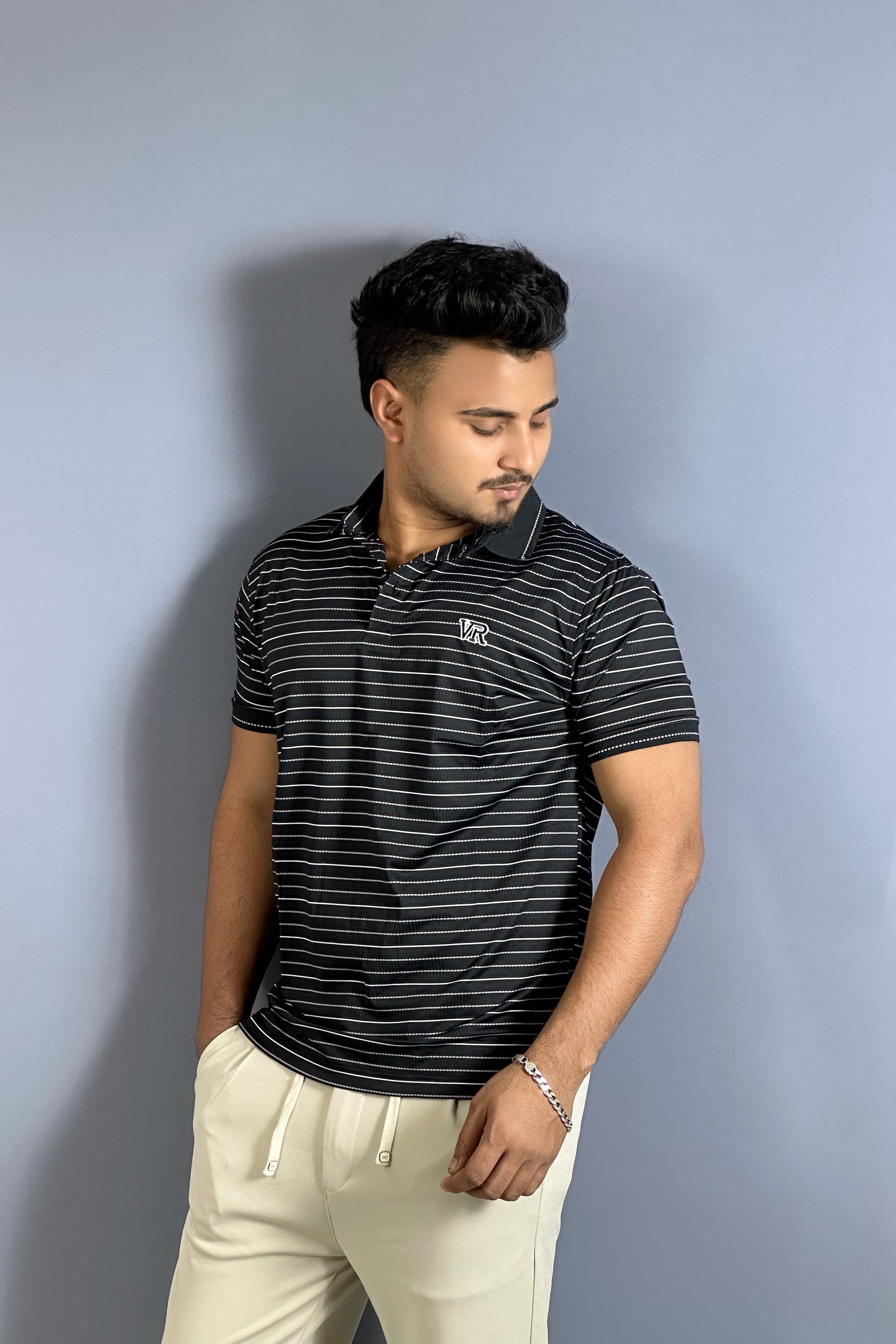কালো কালার হোয়াইট স্ট্রাইপ পোলো টি-শার্ট-VR